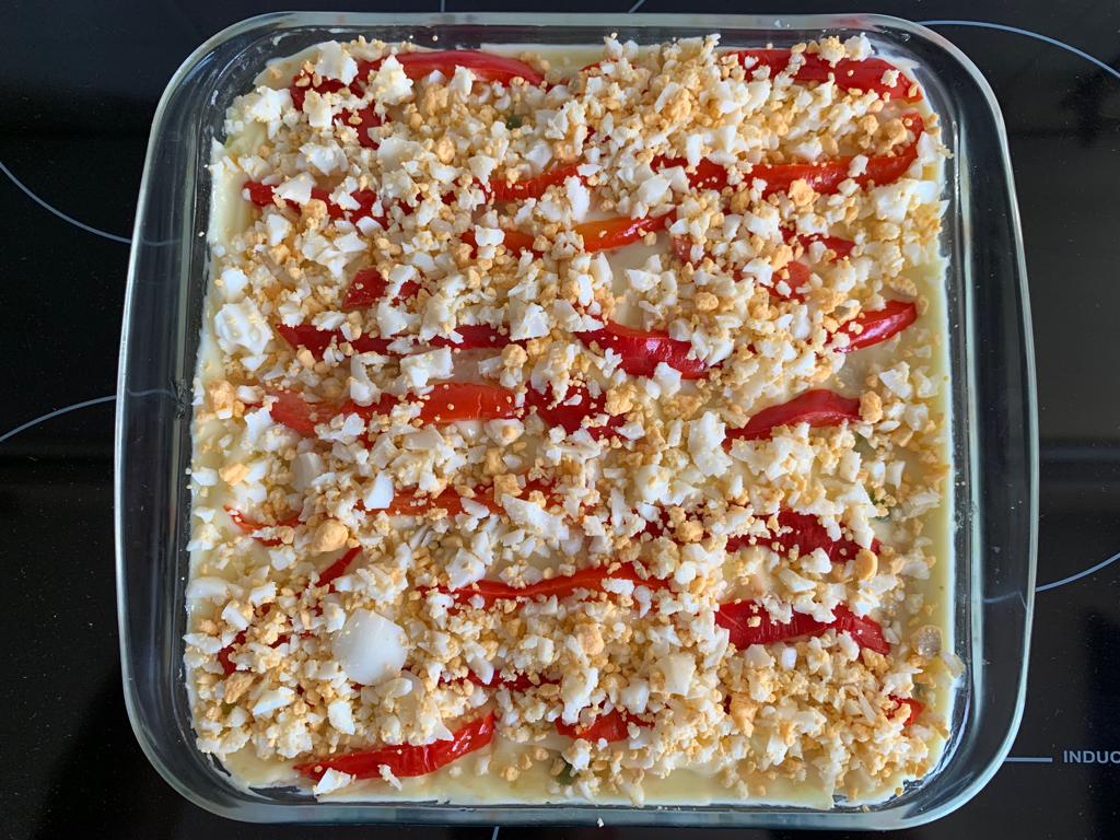 8. Trocear los huevos y junto con los pimientos adornar la ensaladilla