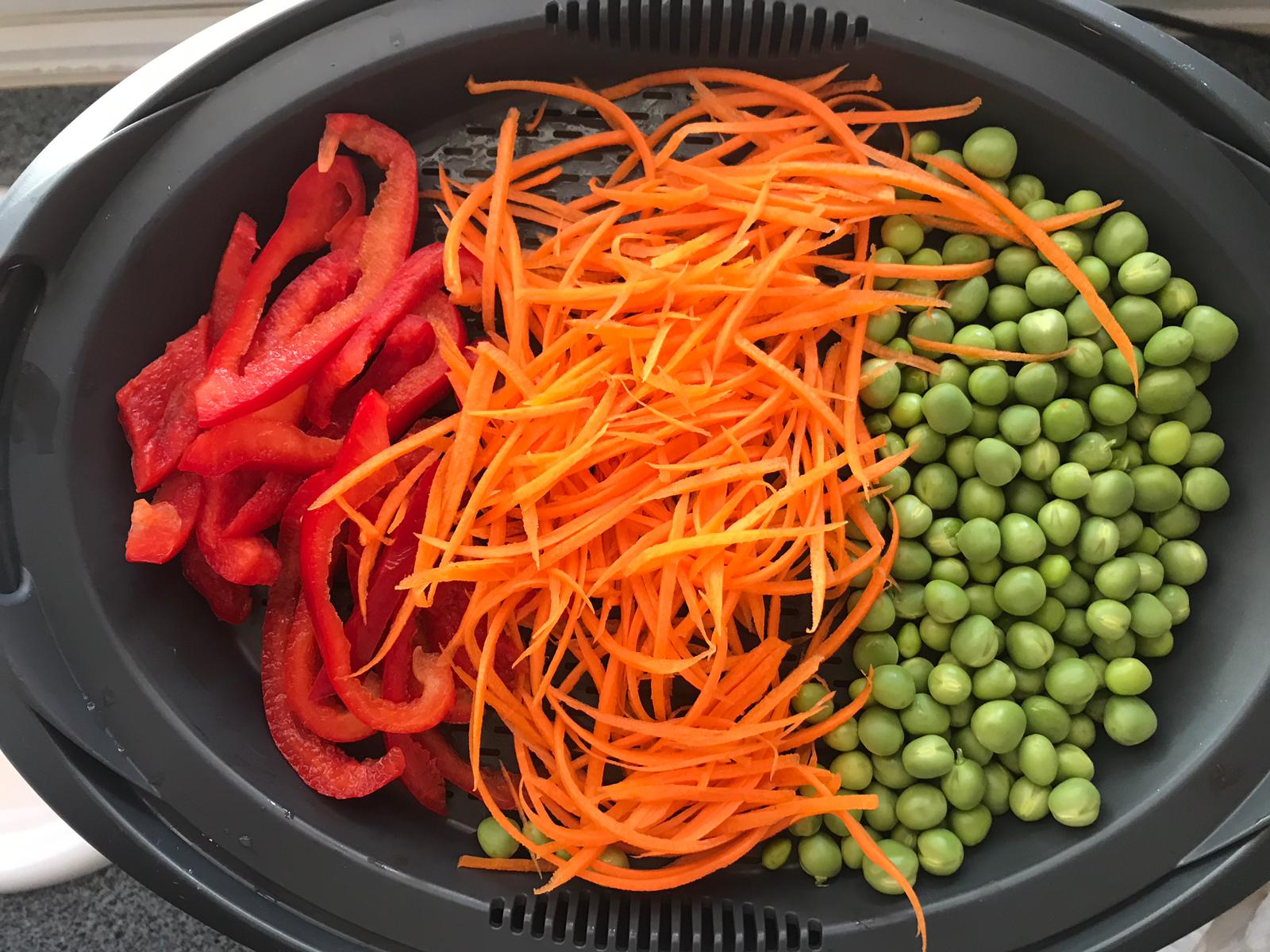 6. Colocar la bandeja Varoma y añadir los los guisantes, zanahorias y pimientos. Tapar y