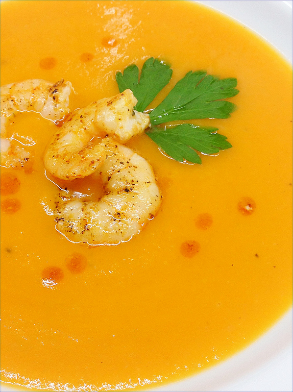Pon en el vaso las pieles de las gambas y el hueso de rape, agrega 500 g de agua y cuece 7 minutos, 100º, velocidad 1. Retira los huesos de rape y tritura los cuerpos de las gambas 30 segundos en velocidad progresiva . Cuela y reserva. Tira los restos.