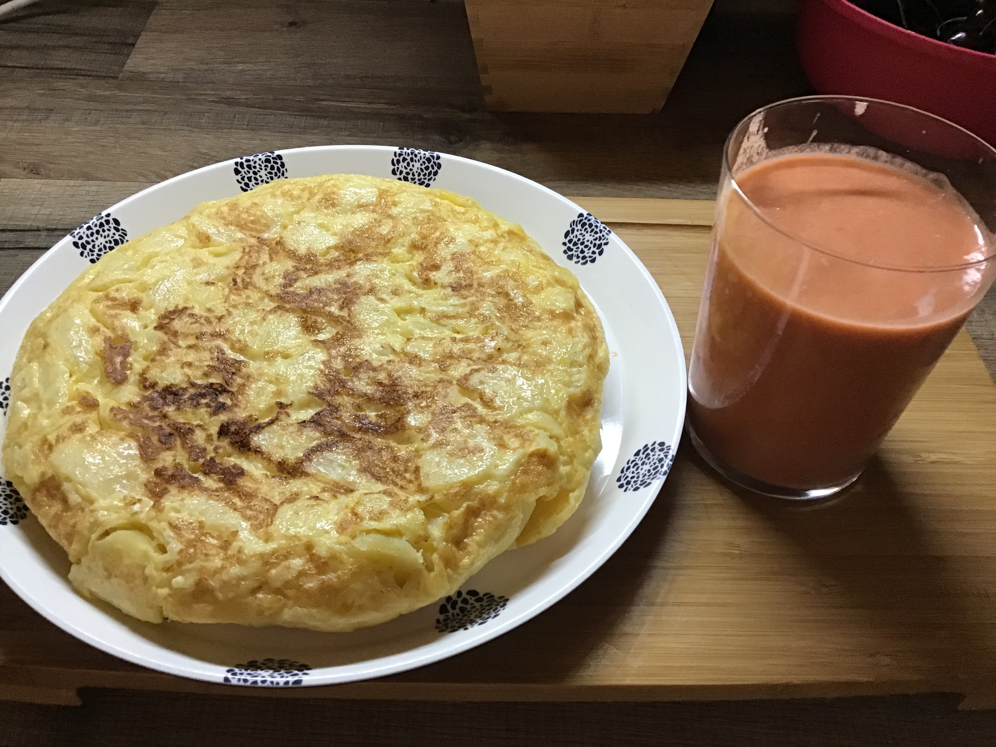 Como es costumbre en mi Málaga querida su acompañante es nuestro rico gazpacho de Thermomix en opción bebido en vaso y que hemos conseguido añadiendo 250 gr de agua con el hielo , si es fría mejor y tenemos un almuerzo completo y fresco para verano