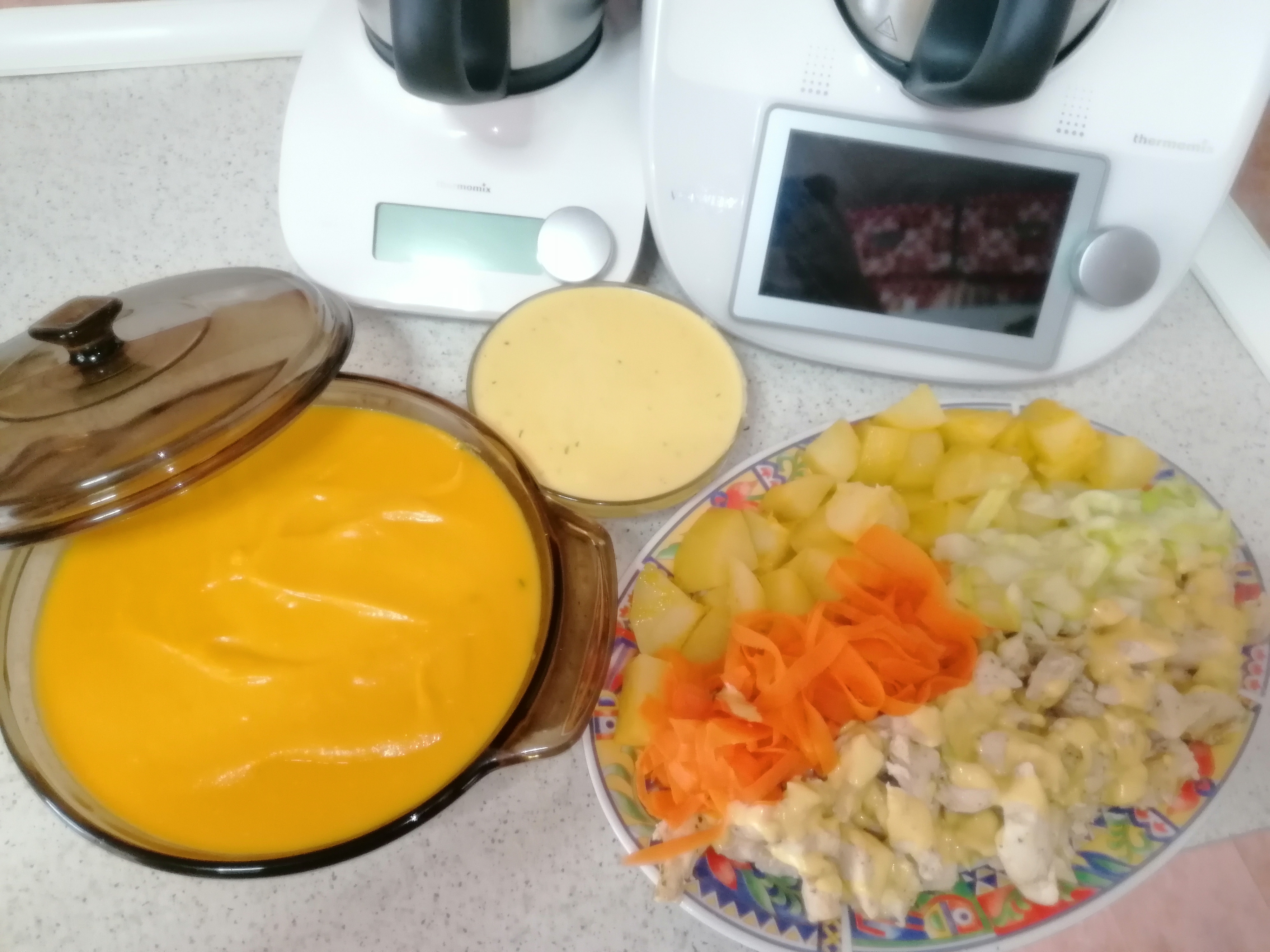 Menú completo de crema de verduras, pollo con salsa suprema y patatas, todo hecho de una sola vez en mi thermomix tm6 Málaga