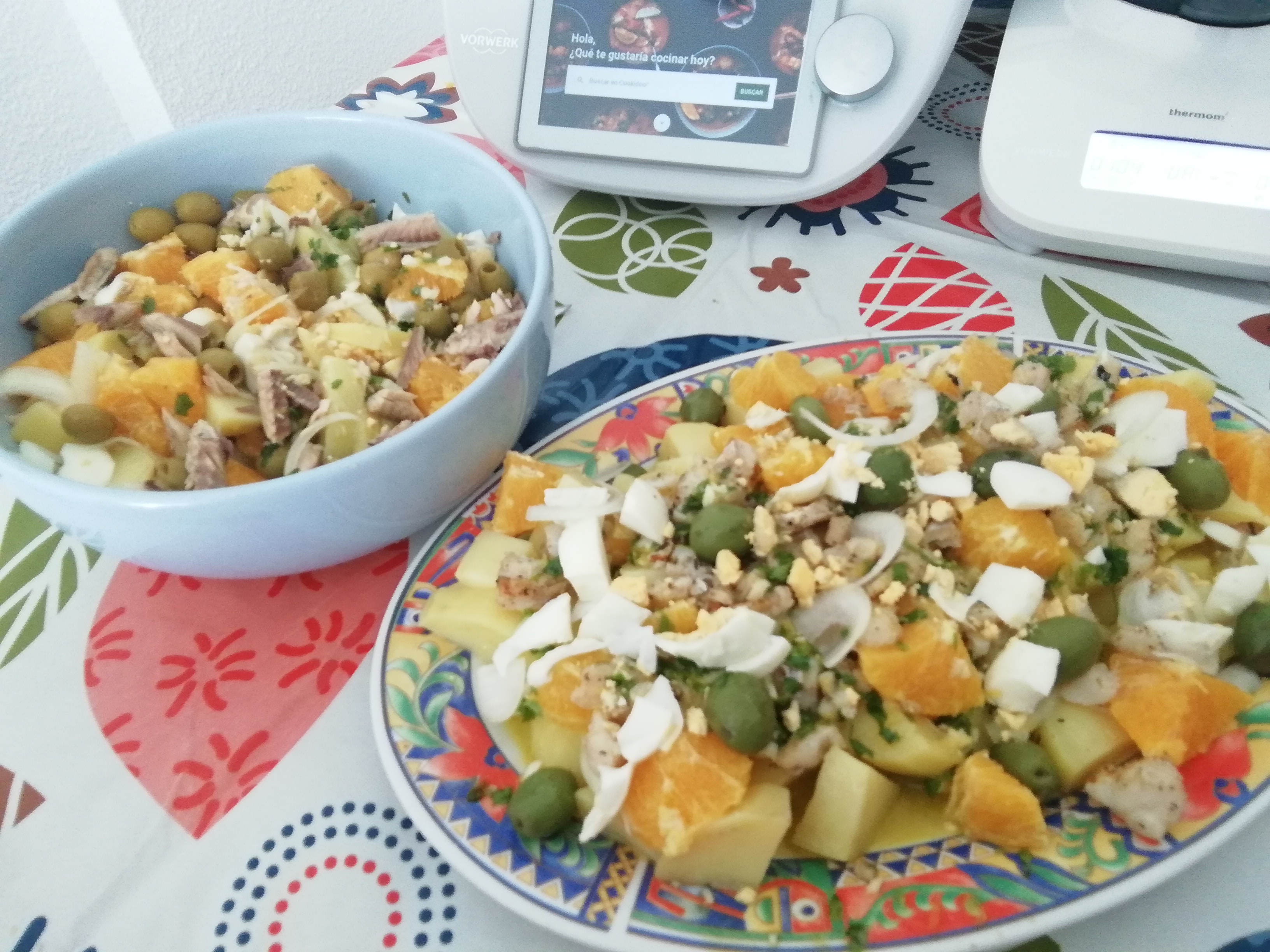 Añada el aceite, el vinagre, el zumo que nos haya salido de cortar las naranjas y la sal. Trocee 3 seg/vel 5. Vierta la vinagreta en la ensaladera y añada el bacalao, o si lo prefiere puede sustituir lo por caballa, atún, surimi,..., la naranja, las aceitunas y los huevos cocidos cortados en trozos. Mezcle con la espátula y reserve en el frigorífico (aprox. 30 minutos) hasta el momento de servir.