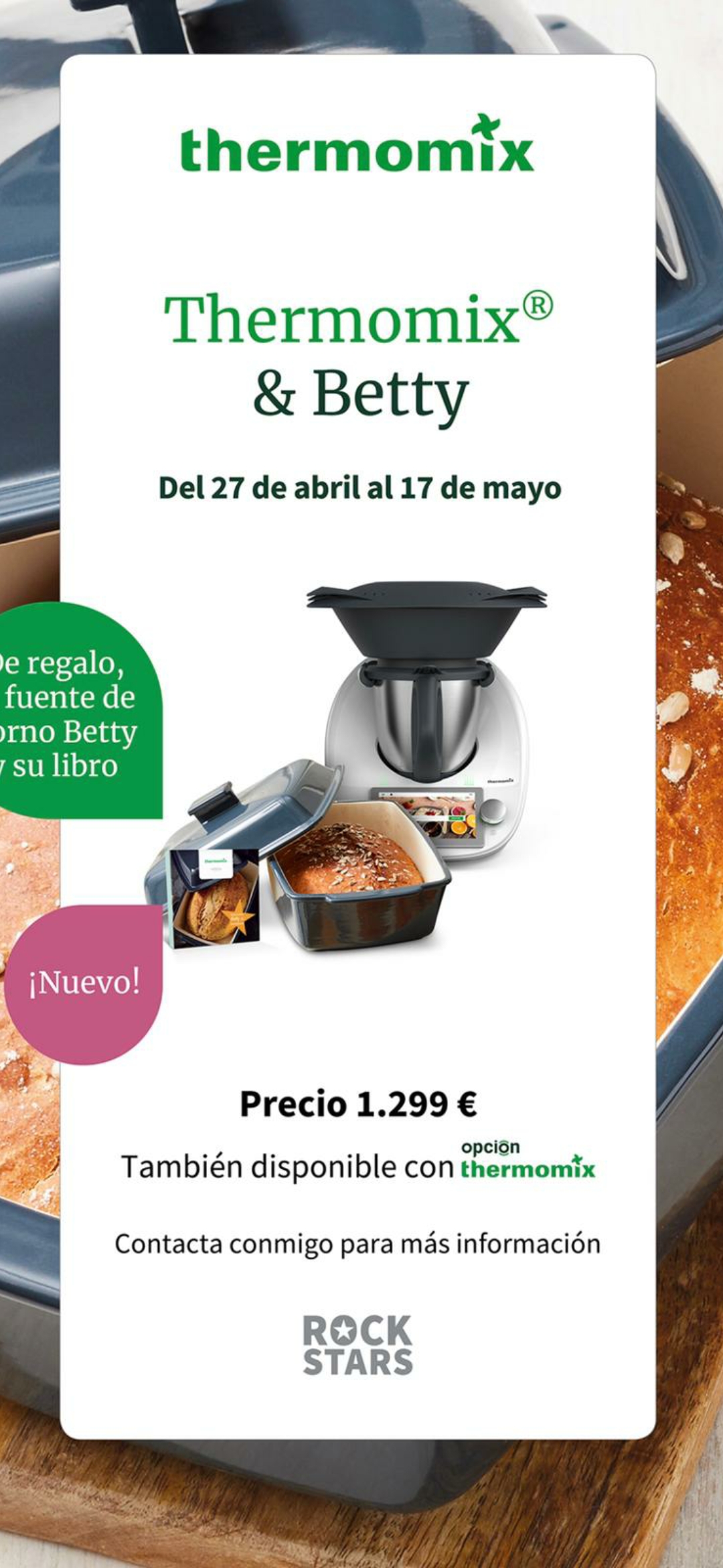 Este mes tienes un regalo esperando por ti, con la compra de tu Thermomix sea de contado o financiado te regalamos la fuente de horno Betty con su recetario, es ideal para hacer ricos panes, carnes, lasaña, verduras y muchas cosas más que en su libro encontraras, el regalo esta valorado en más de 100€, corre que es por tiempo limitado y hasta fin de unidades.