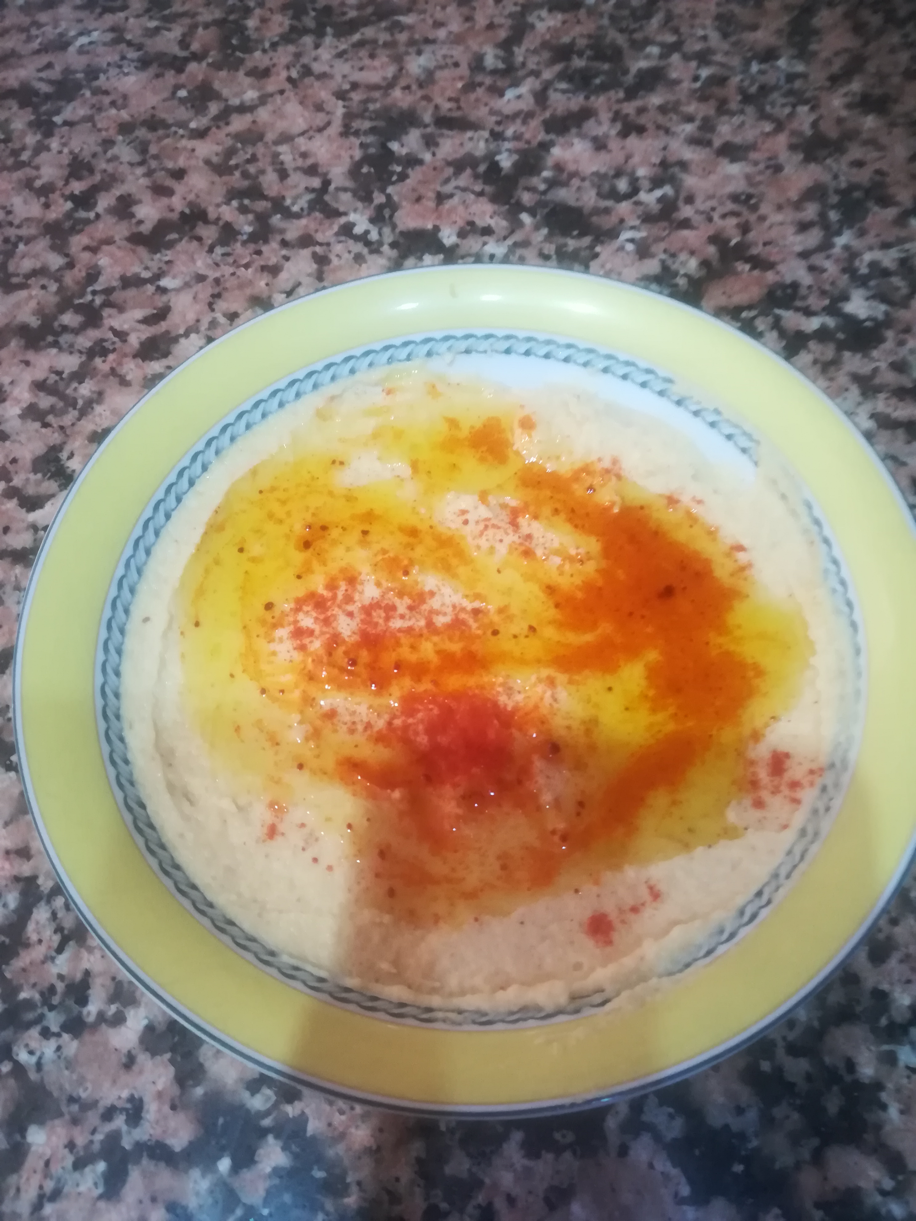Vierta el humus en un plato y rocíe con aceite y pimentón o comino y listo.