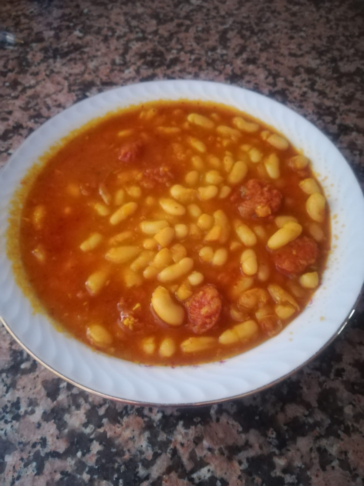 ingredientes 150 de cebolla en cuartos, 100 de pimiento rojo o verde, 2 dientes de ajo,50 g de zanahoria en trozos , 50 de aceite de oliva , 200 g de chorizo en rodajas , 800 de judias blancas ( 2 botes ) ,500 g de caldo ,una hoja de laurel seco y una cucharadita de sal .
