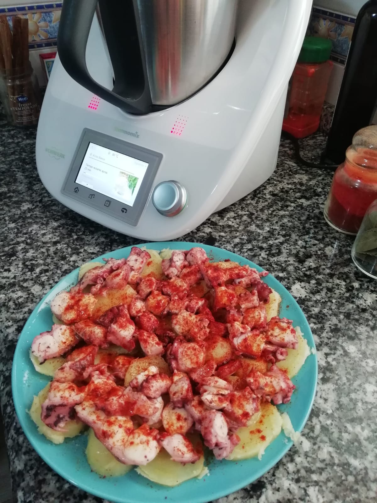 - Introduzca los tentaculos ( o el pulpo entero) dentro del vaso, situa el varoma en su posicion y programa 30 minutos/varoma/giro inverso/velocidad cuchara. deja reposar el pulpo dentro del vaso y coloca las patatas en una fuente o plato de madera.