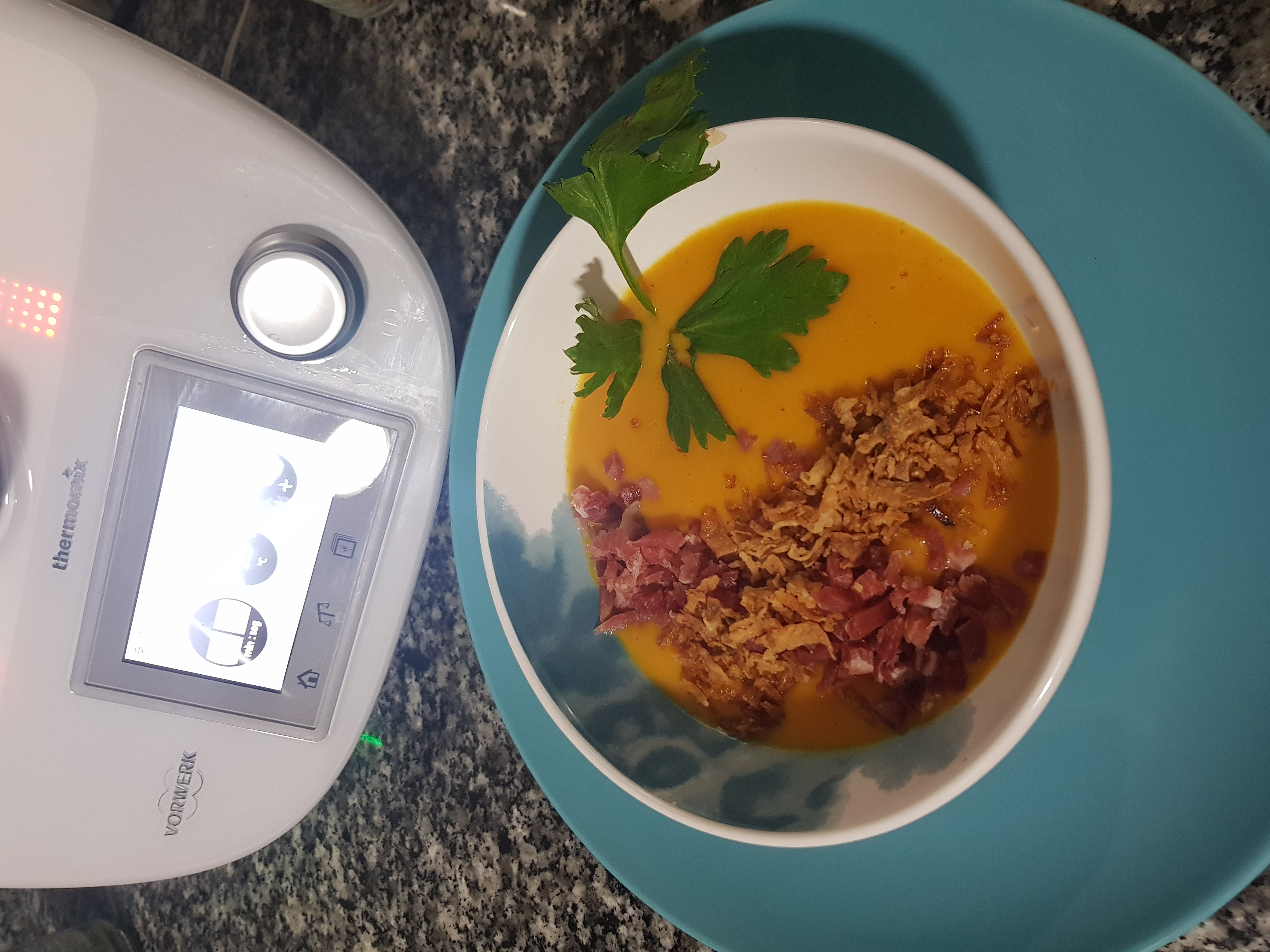 Es un receta muy facil y muy popular en esta epoca del año (otoño e invierno) es un plato muy saludable y apto para vegetarianos y veganos. En la foto viene decorado con un poquito de jamon y cebolla frita ( en este tipo de dietas lo omitiriamos y decorariamos con unas tiras de puerro o apio en crudites). las especies son optativas pero en el invierno vienen genial para entrar en calor.