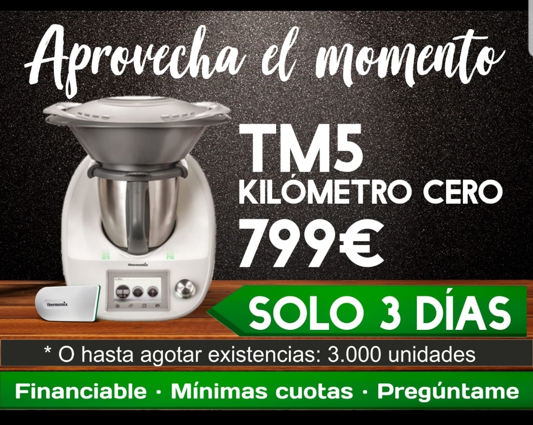 últimas unidades! no te puedes quedar sin ella, es tu oportunidad de tener un tm5, con cook key, todos los accesorios, dos años de garantia y 6 meses de suscripción al mayor libro digital del mundo con más de 40.000 recetas, nuestra plataforma cookidoo.es. Para más información no dudes y contacta conmigo solo tenemos 72 horas o hasta agotar existencias. corre que se agotan.