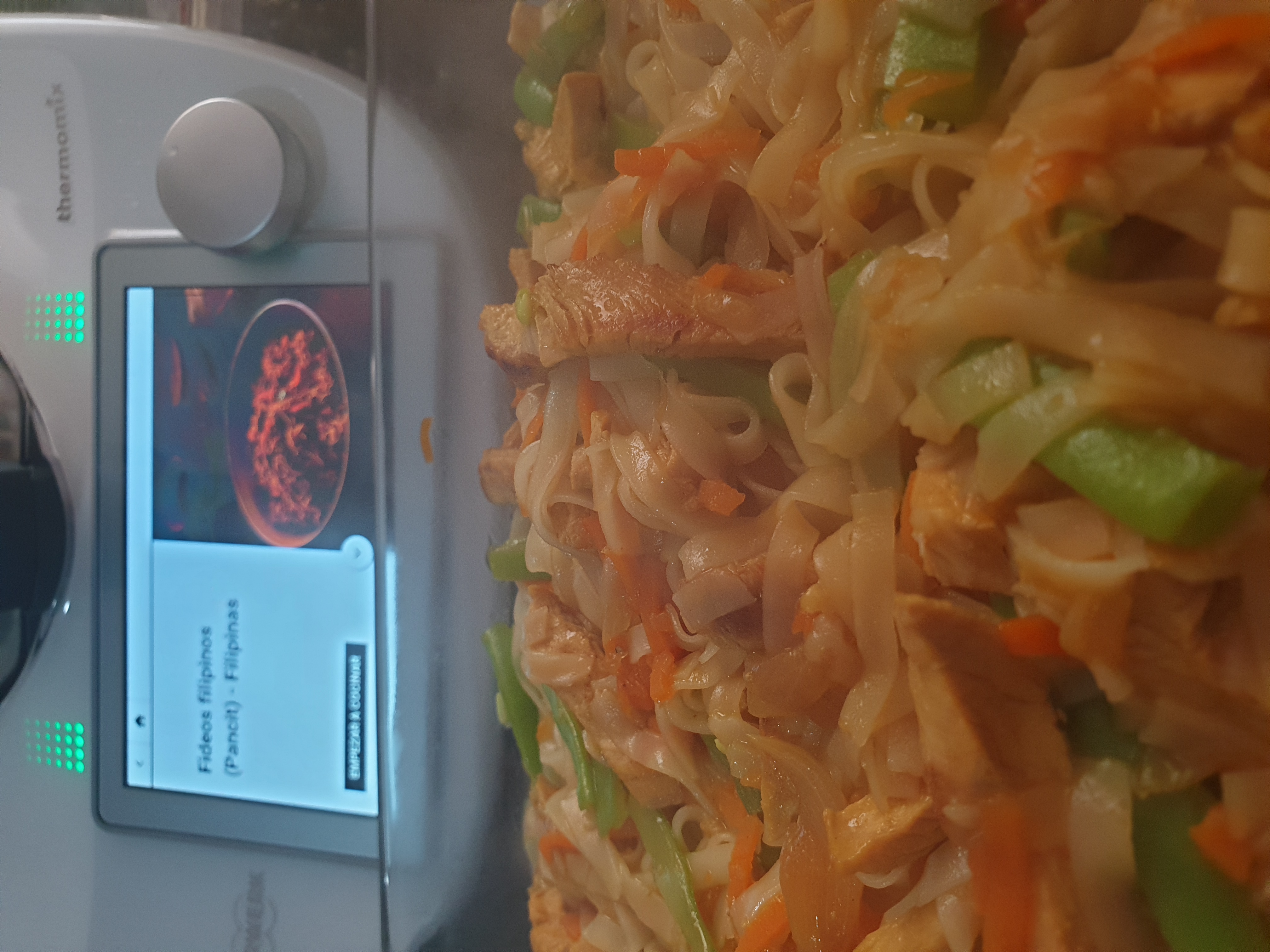- Agregue 120 g. de agua, los 120 g. de salsa de soja. Sitúe el varoma en su posición y programe 10 minutos/varoma/giro inverso/velocidad cuchara. .Mientras tanto escurra los fideos y córtelos con unas tijeras.