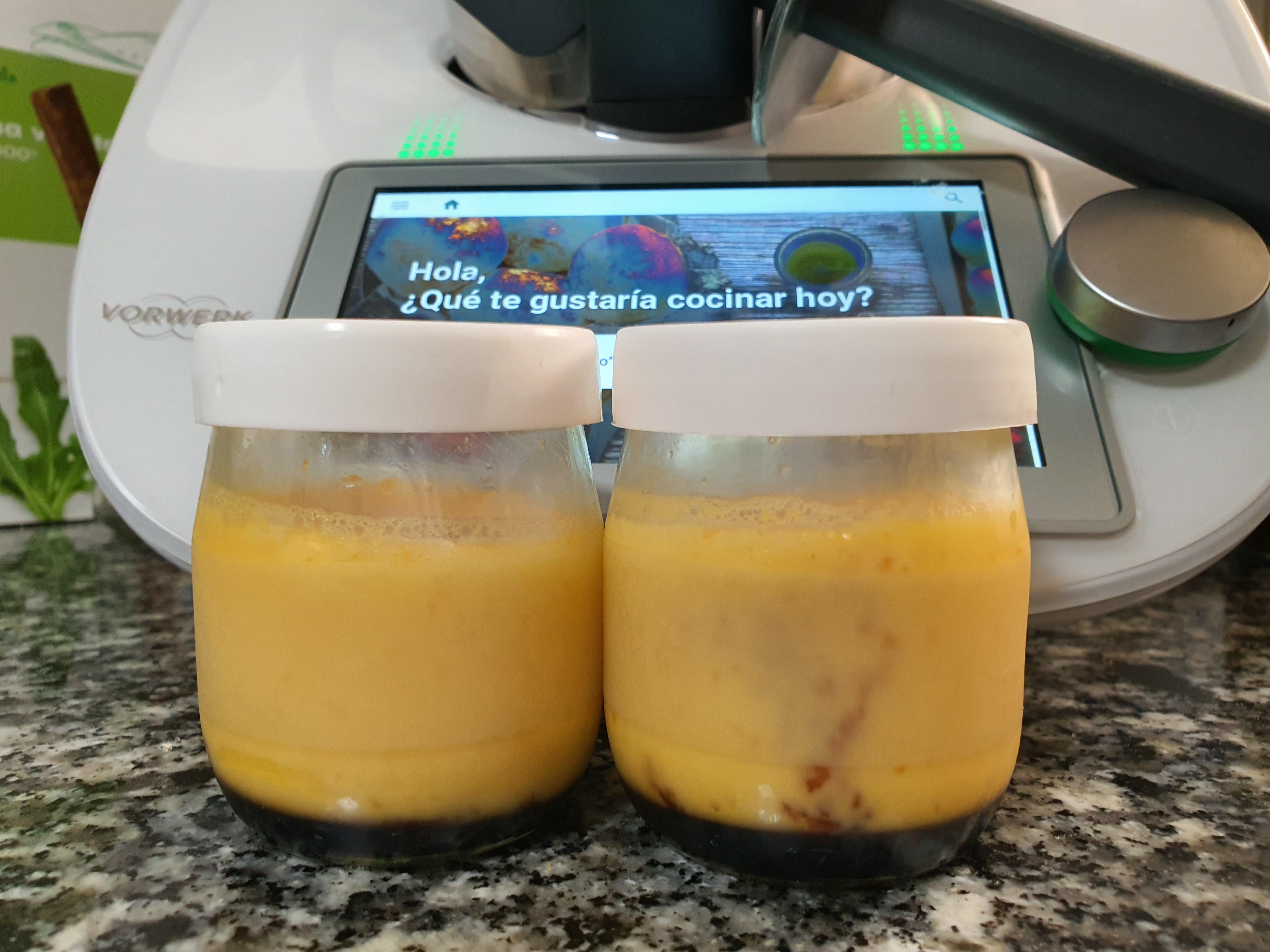 - Pon en el vaso el resto del agua y calienta 4 minutos/100ºC/velocidad cuchara. Mientras tanto vierte la mezcla de huevo en el almíbar y a través de un colador en los moldes caramelizados y tápalos con papel de aluminio o papel film bien tapados. Colócalos en el recipiente varoma, tapa y reserva.